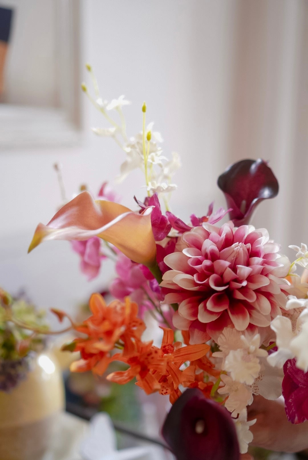 高品質のアーティフィシャルフラワーを使用した、華やかなカラーとダリアのブーケをご用意いたしました✨
