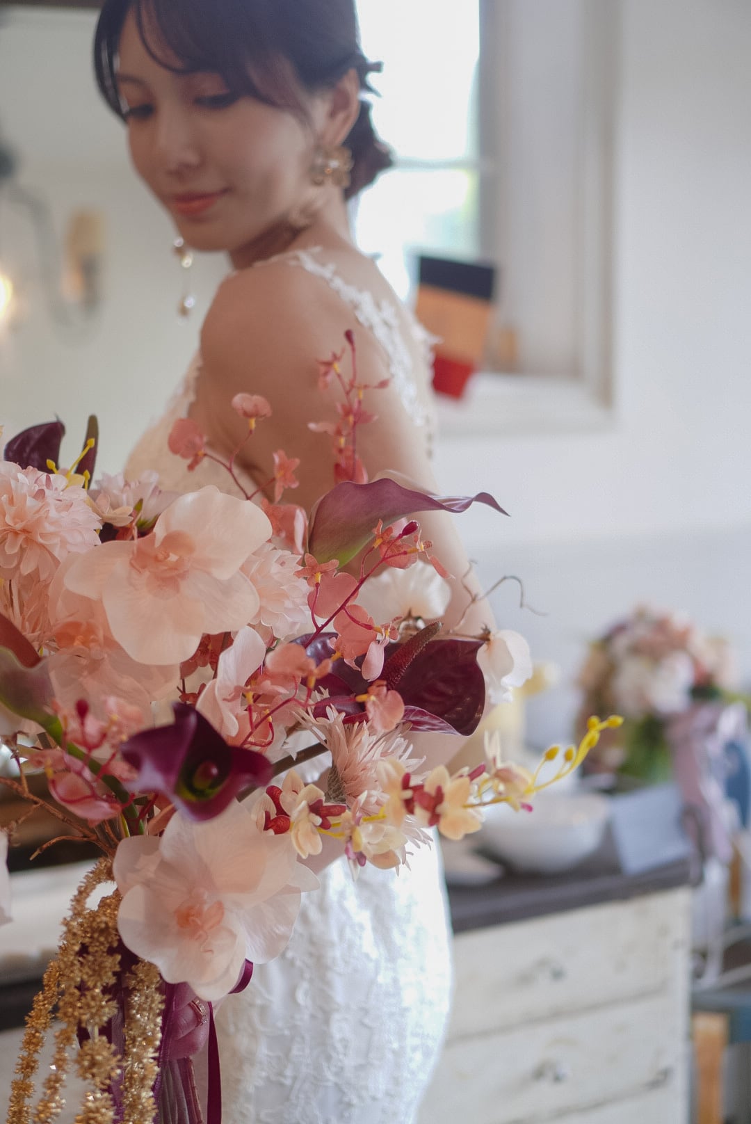 リアルな質感が際立つアーティフィシャルフラワーは、まるで生花のような美しさを持ちつつ、長持ちするのが特長です。リゾート婚や海外ウェディングはもちろん、披露宴やフォトウェディングでも華やかさを添えます。また、 ご使用後はご自宅のインテリアとしてもお楽しみいただけます。