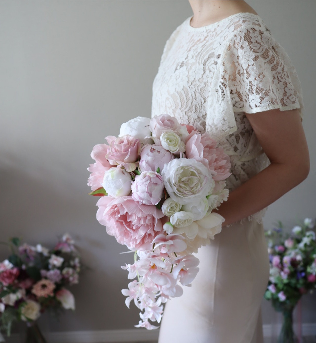 厳選したアーティフィシャルフラワーを使用した胡蝶蘭と芍薬のキャスケイドブーケ。
